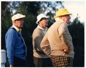 Secretary of State George Shultz, President Ronald Reagan, and Walter Annenberg on the golf course at Sunnylands. Official White House Photo.