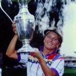 Such a burgeoning splash was augmented in 1988 when Amy Alcott, after capturing her second title at the event, spontaneously leapt into Poppie’s Pond (named for longtime tournament director, Terry Wilcox) adjacent to the 18th green. Alcott, with Shore in tow, would enter the waters again in 1991, and by 1994 the victor’s leap had become an annual and coveted ritual evolving through the event’s modern day sponsor, All Nippon Airways (ANA).