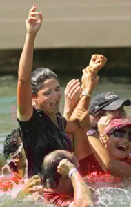 Lorena Ochoa of Mexico celebrates her victory with family and friends in the water after the final round of the Kraft Nabisco Championship in 2008