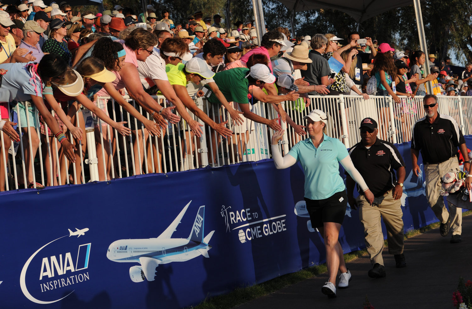 Brittany Lincicome gives high fives to the crowd on her way to the 18th green the ANA Inspiration on the Dinah Shore Tournament in 2015.