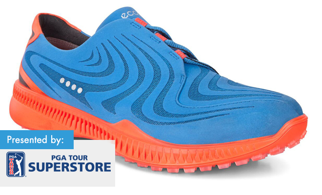 FedEx just delivered a pair of Ecco’s new S-Drive cleatless golf shoes ($160) bearing a design inspired by running shoes – a look that’s, well, interesting. The widely spaced lace in each shoe resides toward the innermost side of each kick, above the arch. The company calls this “asymmetrical closure” and claims it results in excellent support and stability. The soft mesh upper – bonded with microfiber – has an unusual, almost-hypnotic raised pattern.