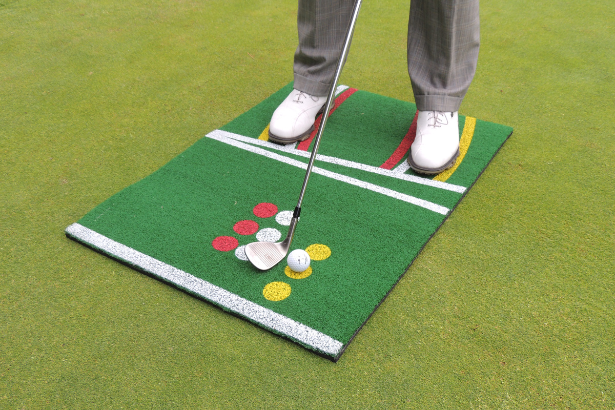 Hitting chunky chip shots? Use the Perfect Pitch Golf Mat to hit better chip, pitch, sand and lob shots. The mat outlines where to place your feet and golf ball to allow for proper aim and distance in the shot you’re trying to hit.
