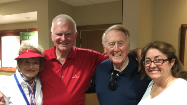 Ross Jr. is the son of Ross Porter, the former longtime Dodgers radio broadcaster and current play-by-play announcer for the Cal State Northridge baseball team. Ross Sr. is also the co-director of the golf tournament, along with his daughter-in-law. Ross is in charge of bringing celebrities to the event, and he’s aced that. Some of the celebrities included James Worthy, Eric Karros, Ron Cey, Shawn Green, and a who’s-who of broadcasters have played in the event. Recently retired Vin Scully attended the event to sign and take pictures, as he does every year, and former Dodgers owner Peter O’Malley and Tommy Lasorda attended the dinner and auction as well.