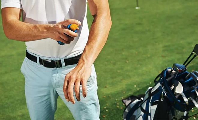 The first line of defense is sun-protection apparel. The material is really helpful for areas where we never apply sunscreen — hello, back — and it doesn’t need to be reapplied during the round.