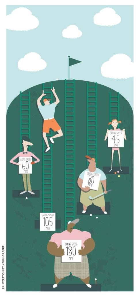 And by “success” and “fun,” he means a realistic expectation of reaching a green in regulation. So let’s put to rest that antiquated — and always false — notion that as long as various tees put players into the same position in the fairway, it is fair. Yardage differential between players continues from driver through the bag, and speed also equates to higher flight and more carry.