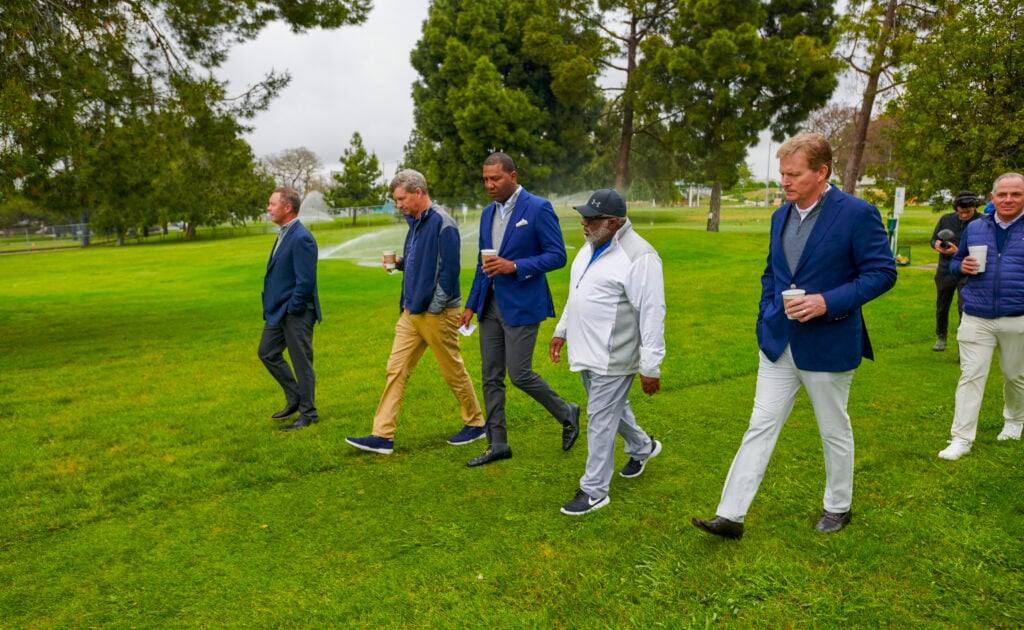 Left to right; Mike Whan, USGA CEO, Gil Hanse, Fred Perpall, USGA President, Glen Porter, and Kevin Hammer after meeting with officials from the SCGA, the City of Los Angeles and Los Angeles County at the Maggie Hathaway Golf Course in Los Angeles , Calif. on Monday, May 1, 2023. (Copyright USGA/Don Liebig)