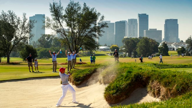 Norman Xiong (USA) plays from a green side bunker on the 12th hole during singles at the 2017 Walker Cup at The Los Angeles Country Club.