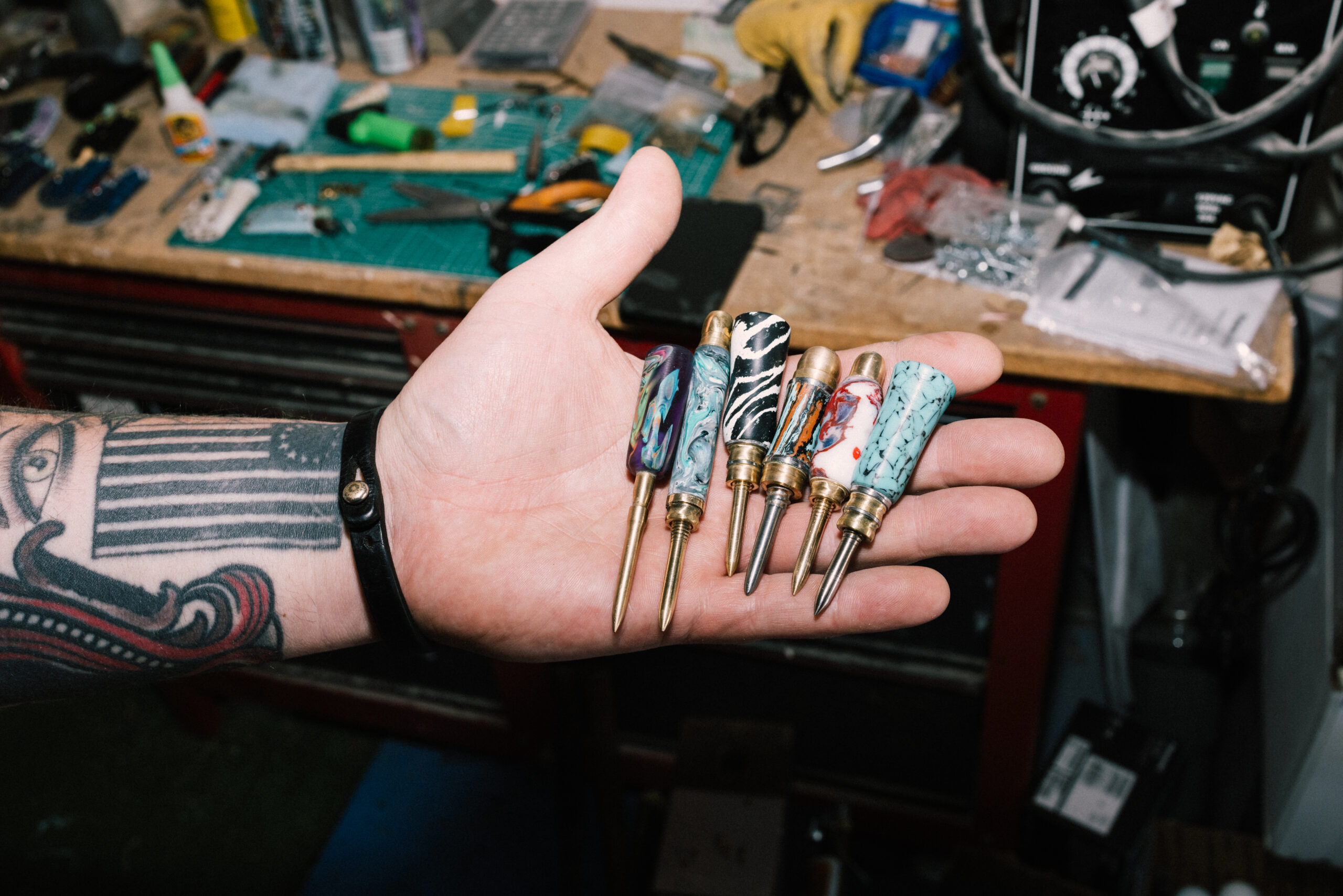 Again, no two tools are alike. He had to abandon working with resin on advice from his doctors after a bout with cancer last year (more about that later), so today the handle is composed of anodized aluminum, often fashioned as a colorful set of spinners. “Kind of like fidget spinners. They keep you entertained while you’re waiting on the group in front of you.” Then he adds, deadpanning, “You can take your mind off your next shot while you stand there playing with your tool.”