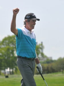 Ian Baker-Finch pumps his fist after sinking a birdie putt on the third playoff hole to win the Liberty Mutual Insurance Legends of Golf Raphael Division in 2013.