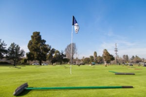 “Break It You Buy It,” stated the tee box sign. Good thing we were near the parking lot for a quick getaway. But after four tentative driver swings and no sound of destruction – we were in the clear.