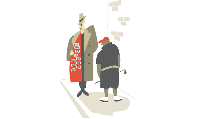 I know of one such miserly wretch who mops up multiple tee-times daily and then figures out how to fill them as they approach, so he doesn’t have to suffer the 10-buck cancellation fee if he can’t find willing stooges to fill out the group. There oughta be a law, I tell ya.