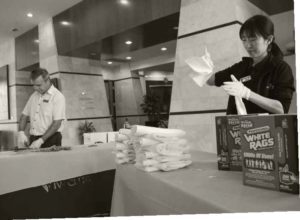“We had people in our lobby, doing this together, 10 to 12 hours a day, cutting the CAT5 wire (to support the rubber bands), counting the rubber bands, separating piles, coordinating pick up and drop-offs, putting it all together in bags,” Tebbetts detailed. “And we were running just to-go from our restaurant menu, and also grocery items; so much of the kit-making was our food and beverage staff. George Edwards, our engineer, and a lot of his staff also spent a lot of time putting them together as well.”