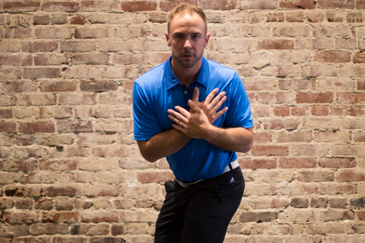 - Start with your hands across your chest and get in your golf set-up position.
